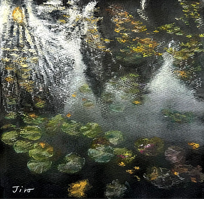 まず先に水彩絵の具で(マイナスイオンを感じる)水面と水面に映る木々の影を、乾かしてから次にパステルで睡蓮と木々から漏れる光を乗せて最後に太陽のきらりをハイライトするというもの。