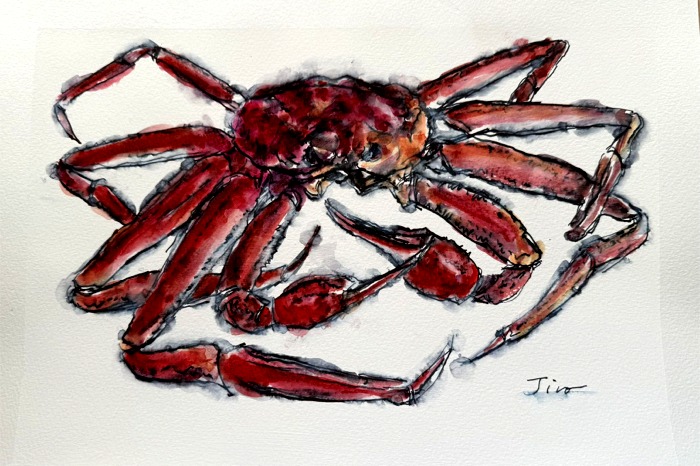 ジェッソを使って水性インクと水彩絵の具で、冬の味覚の王様であるズワイガニを描く練習をした。