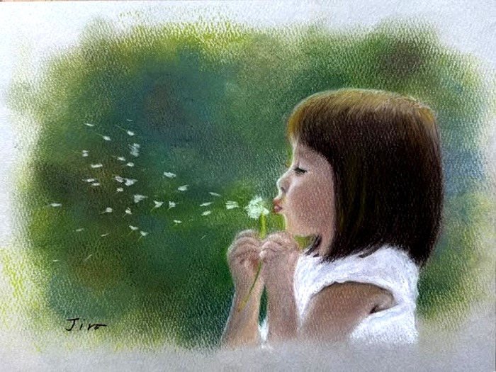 今回も教材写真モチーフから描く練習で、小生は"タンポポの綿毛を吹き飛ばす少女"にした。